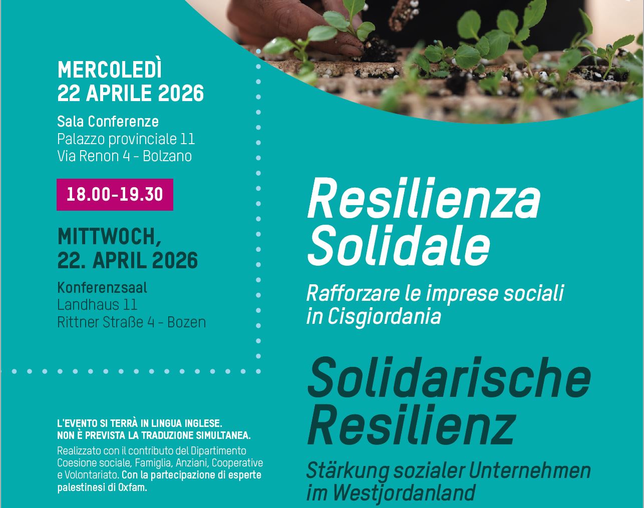 L’evento intende presentare i risultati del progetto di cooperazione allo sviluppo “IBTKAR for Social Change”, realizzato nei territori palestinesi e cofinanziato dalla Provincia autonoma di Bolzano – Alto Adige e dall’Agenzia Italiana per la Cooperazione allo Sviluppo – AICS.
